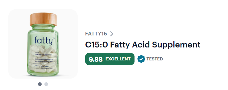 Not only did fatty15 earn a TESTED by SuppCo certification, it has a TrustScore™ of 9.88, (representing the top 1% of all supplements) fatty15 demonstrates outstanding reliability and quality as a C15:0 fatty acid supplement.