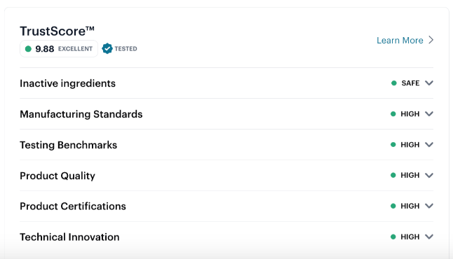 Their “TESTED by SuppCo” program independently buys and tests supplements in ISO-accredited labs, verifying that the active ingredients match the label claims, with a minimum threshold of 95% accuracy. SuppCo also has a TrustScore that evaluates supplements based on 30+ quality indicators across 5 key categories.