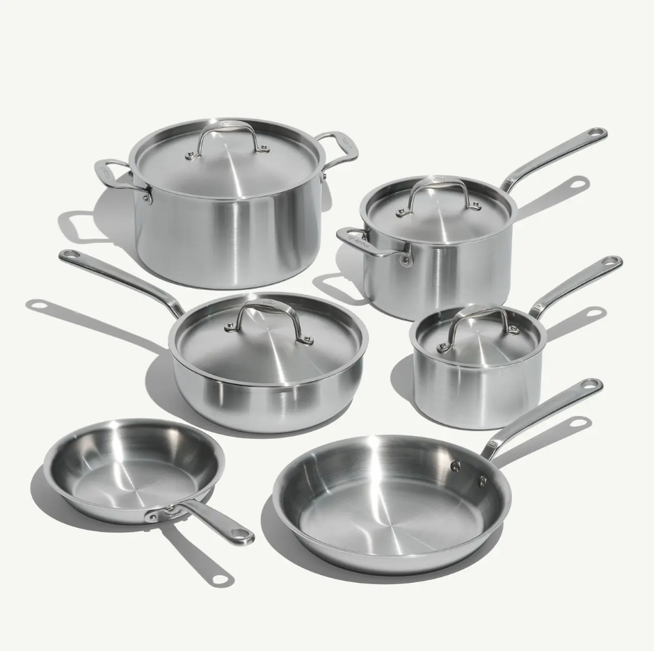 If you’ve ever wondered what professional chefs mean by “a complete set,” this is it. Made In’s 10-Piece Stainless Clad Set includes everything you need for everyday cooking — from Sunday slow-simmers to weeknight one-pan wonders. Each piece is crafted from 5-ply stainless clad for even heat and lasting durability, and every detail (right down to the stay-cool handles) is designed for comfort and control.